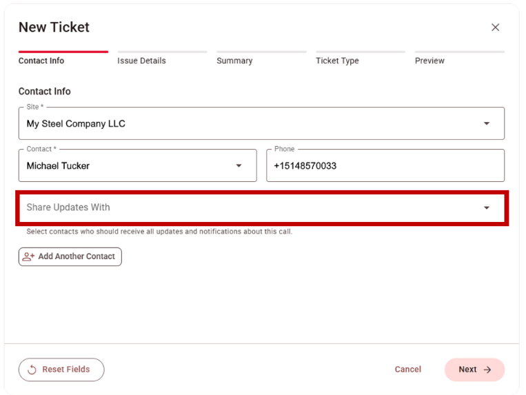 Share Updates With – Select additional contacts to automatically receive updates, emails, and notifications on the ticket’s progress.