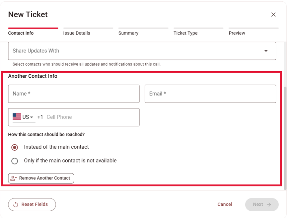 Add Another Contact – The system now clearly indicates when this additional contact should be reached. This alternate contact can be reached if the main contact is unavailable or instead of the main contact, ensuring communication continues seamlessly.