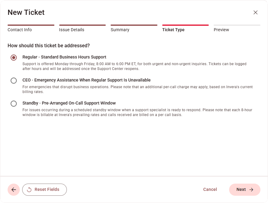 Ticket Creation Wizard – A step-by-step process guides you through placing support tickets with clear prompts for contact details, incident type, and attachments.